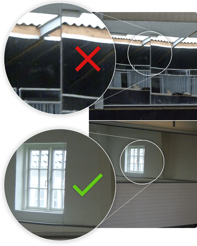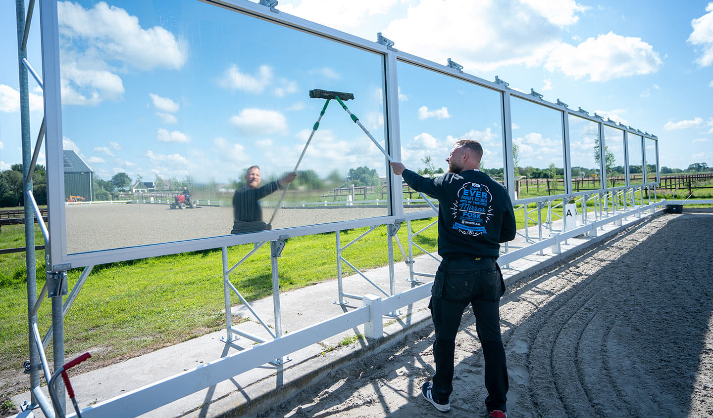Mit einem Spiegel in der Reithalle haben sowohl Reiter als auch Trainer einen klaren Blick auf die Bewegungen und die Haltung von Reiter und Pferd. Dies erhöht die Effizienz des Trainings und führt zu besseren Leistungen. Denn auch im Pferdesport ist der Blick fürs Detail der Schlüssel zum Erfolg. Bei uns finden Sie qualitativ hochwertige und sichere Reithallenspiegel. Diese weisen nur eine minimale optische Verzerrung auf und sind in jeder Größe erhältlich. Die Spiegel werden von unseren Experten schnell und professionell montiert.